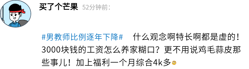 除了养家糊口、人情往来、还要买车买房,工资水平太低了,让男教师无法承担养家重担。