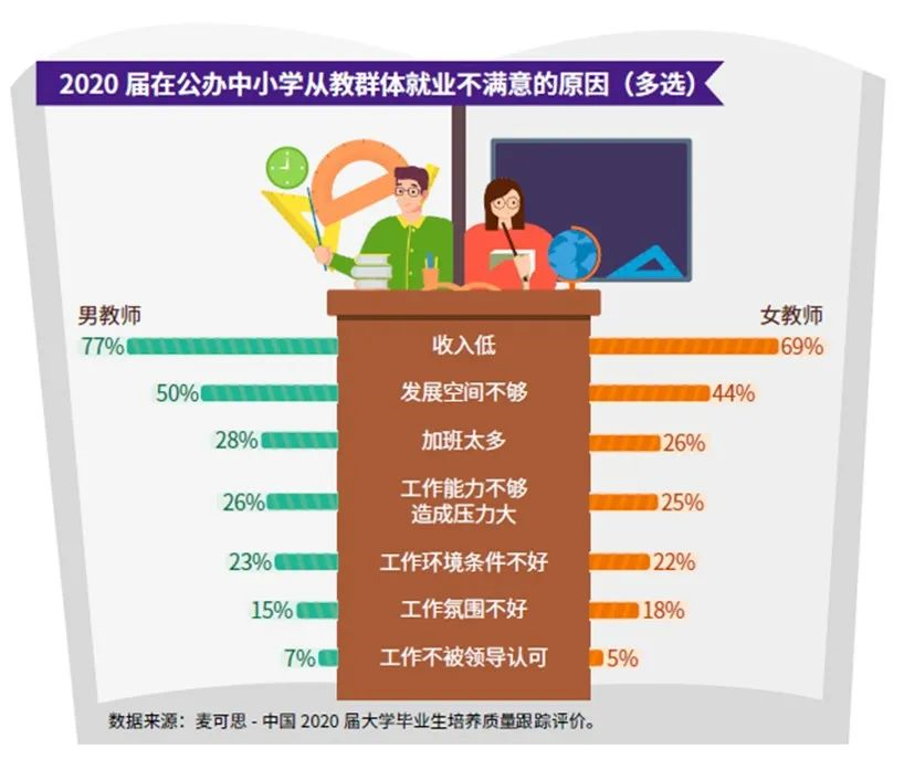 是对就业不满意的最主要原因。教师这个职业大家都知道是“铁饭碗”,工资相对稳定的同时,薪资水平也比较平均。