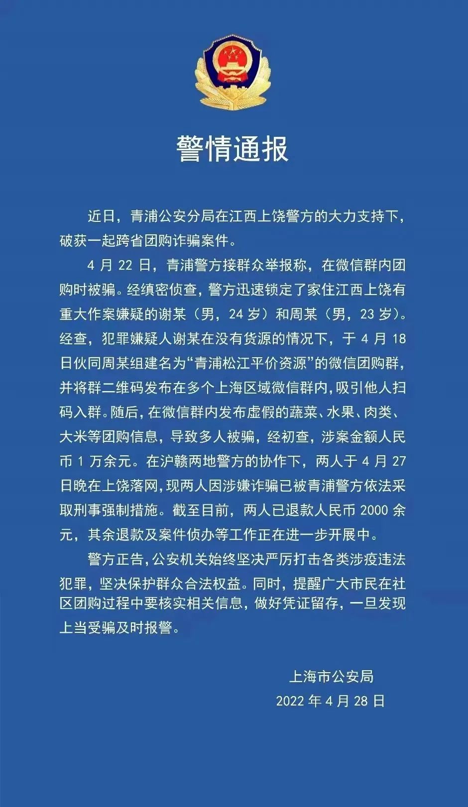 4月22日,青浦警方接群众举报称,在微信群内团购时被骗。经缜密侦查,警方迅速锁定了家住江西上饶有重大作案嫌疑的谢某(男,24岁)和周某(男,23岁)。经查,犯罪嫌疑人谢某在没有货源的情况下,于4月18日伙同周某组建名为“青浦松江平价资源”的微信团购群,并将群二维码发布在多个上海区域微信群内,吸引他人扫码入群。随后,在微信群内发布虚假的蔬菜、水果、肉类、大米等团购信息,导致多人被骗,经初查,涉案金额人民币1万余元。在沪赣两地警方的协作下,两人于4月27日晚在上饶落网,现两人因涉嫌诈骗已被青浦警方依法采取刑事强制措施。截至目前,两人已退款人民币2000余元,其余退款及案件侦办等工作正在进一步开展中。