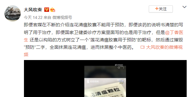 即便官媒在不断的介绍连花清瘟胶囊不能用于预防,即便该药的说明书清楚的写明了用于治疗,即便国家卫健委诊疗方案里面写的也是用于治疗,但是@丁香医生 还是以构陷的方式树立了一个“莲花清瘟胶囊用于预防”的靶标,然后通过摧毁“预防”二字,全面抹黑连花清瘟,进而抹黑整个中医药。