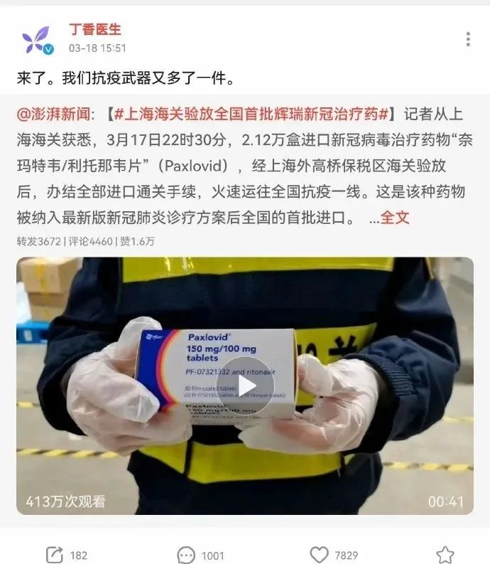 2022年3月18日,上海海关验放全国首批辉瑞新冠特效药,“我们的抗疫武器又多了一件”。