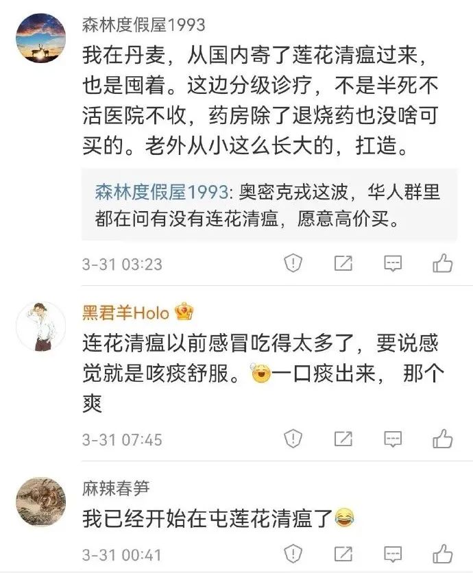 我们看一些在海外的华人对于连花清瘟的评价。(注:这些微博账号均验过IP,全部来自境外,为减少篇幅不再单独列出)