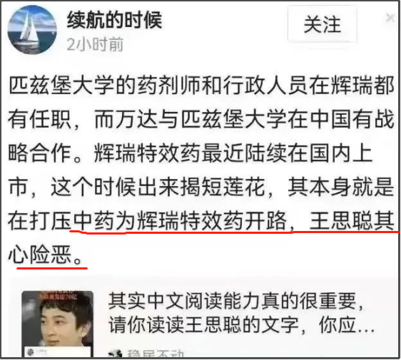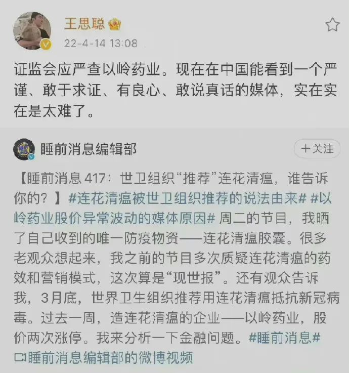 然后“奇迹”就出现了,万达集团的“少东家”、所谓的“国民老公”王思聪精准的传了这篇帖子,还评论说:证监会应严查以岭药业。现在在中国能看到一个严谨、敢于求证、有良心、敢说真话的媒体,实在实在是太难了。
