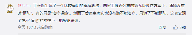 丁香医生玩了一个比较高明的春秋笔法,国家卫健委公布的第九版诊疗方案中,通篇没有说“预防”,有的只是“治疗轻症”。然而丁香医生确实也没有说不能治疗,只说了不能预防。这就实现了在不“造谣”的前提下,把舆论带偏。