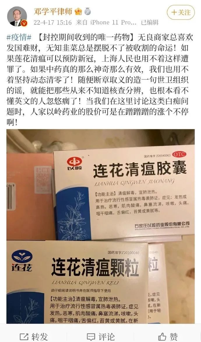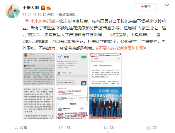 一盒连花清瘟胶囊,先有国民老公王校长亲自下场手撕以岭药业,后有丁香医生“不要吃连花清瘟预防新冠”话题引导,还炮制“占据三分之一运力”的笑话,更有复旦大学严锋教授推波助澜……只提莲花,不提辉瑞, 一盒2300元的辉瑞,可以买200盒莲花,打着科学的幌子,各路资本,牛鬼蛇神,内外weigong,不余遗力,背后满满都是利益。
