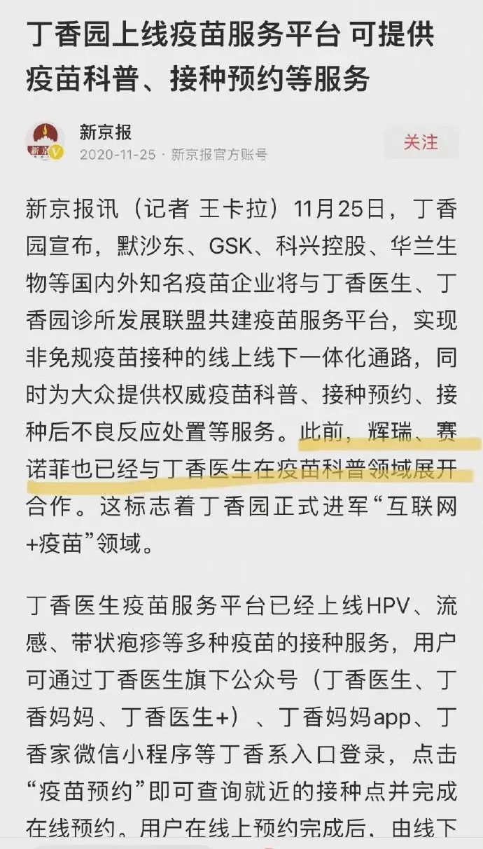 2020年11月25日,“新京报”在《丁香园上线疫苗服务平台 可提供疫苗科普、接种预约等服务》的新闻报道中,明确写道“”。