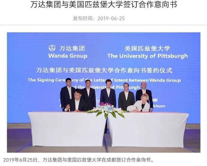 2019年6月25日,万达集团与美国匹兹堡大学签订合作意向书的新闻报道截图。