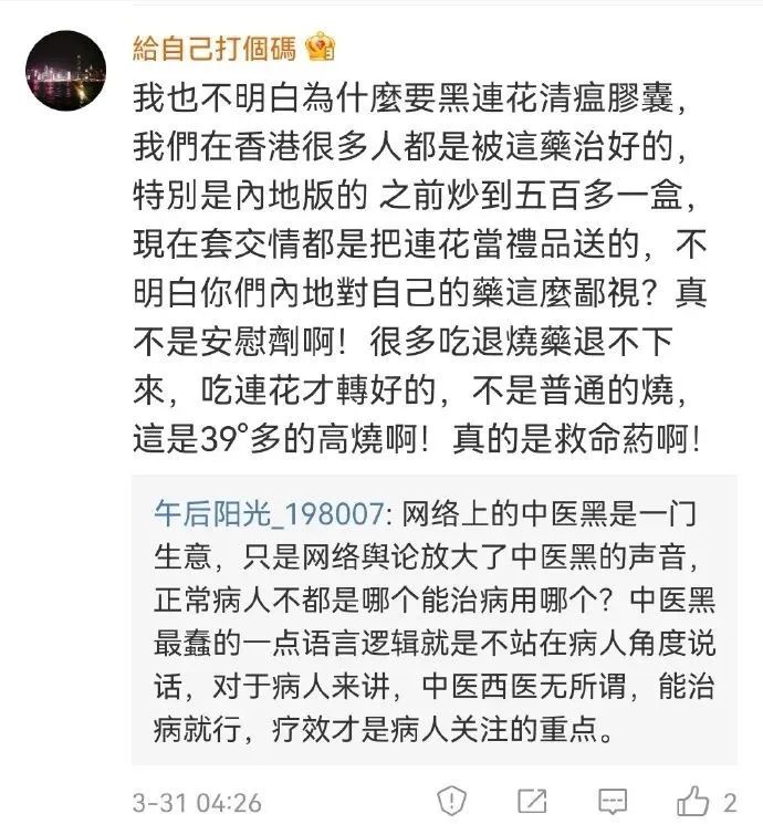 该网民还回答了为什么@丁香医生 会把莲花清瘟当成标靶?称原因也比较简单: