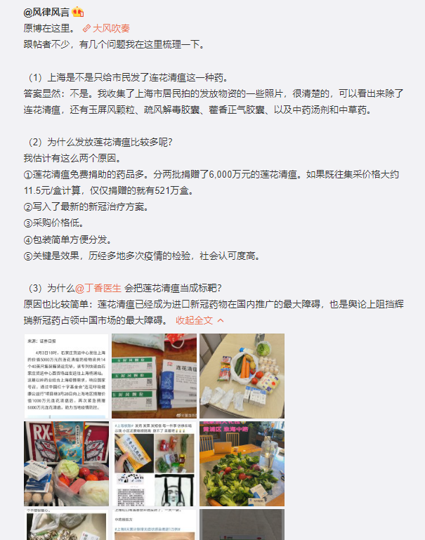 有网民进行了系统性的梳理,指出上海给市民发的不仅仅有连花清瘟,还有玉屏风颗粒、疏风解毒胶囊、藿香正气胶囊、以及中药汤剂和中草药。而发连花清瘟比较多的原因是捐赠的多,还便宜,且写入了最新的新冠治疗方案,关键是效果,历经多地多次疫情的检验,社会认可度高。还包装简单方便分发。