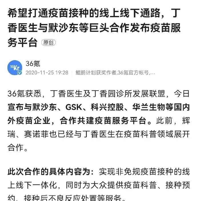 :在“36氪”在2020年11月25日的报道《希望打通疫苗接种的线上线下通路,丁香医生与默沙东等巨头合作发布疫苗服务平台》,内容也赫然写着“”的字样。