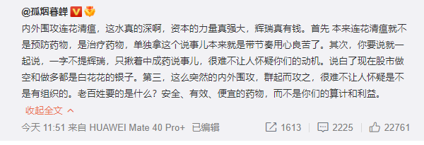 内外weigong连花清瘟,这水真的深啊,资本的力量真强大,辉瑞真有钱。首先 本来连花清瘟就不是预防药物,是治疗药物,单独拿这个说事儿本来就是带节奏用心良苦了。其次,你要说就一起说,一字不提辉瑞,只揪着中成药说事儿,很难不让人怀疑你们的动机。说白了现在股市做空和做多都是白花花的银子。第三,这么突然的内外weigong,群起而攻之,很难不让人怀疑是不是有组织的。老百姓要的是什么?安全、有效、便宜的药物,而不是你们的算计和利益。