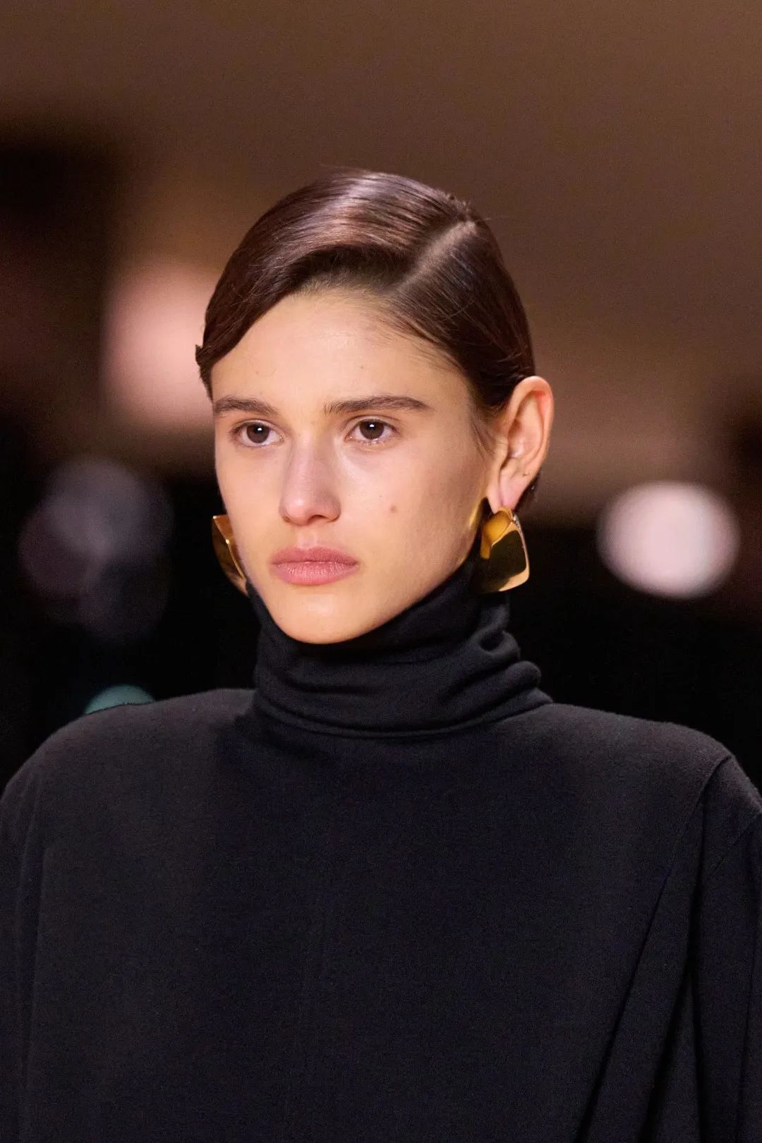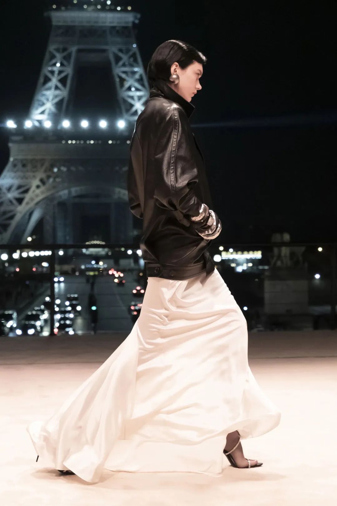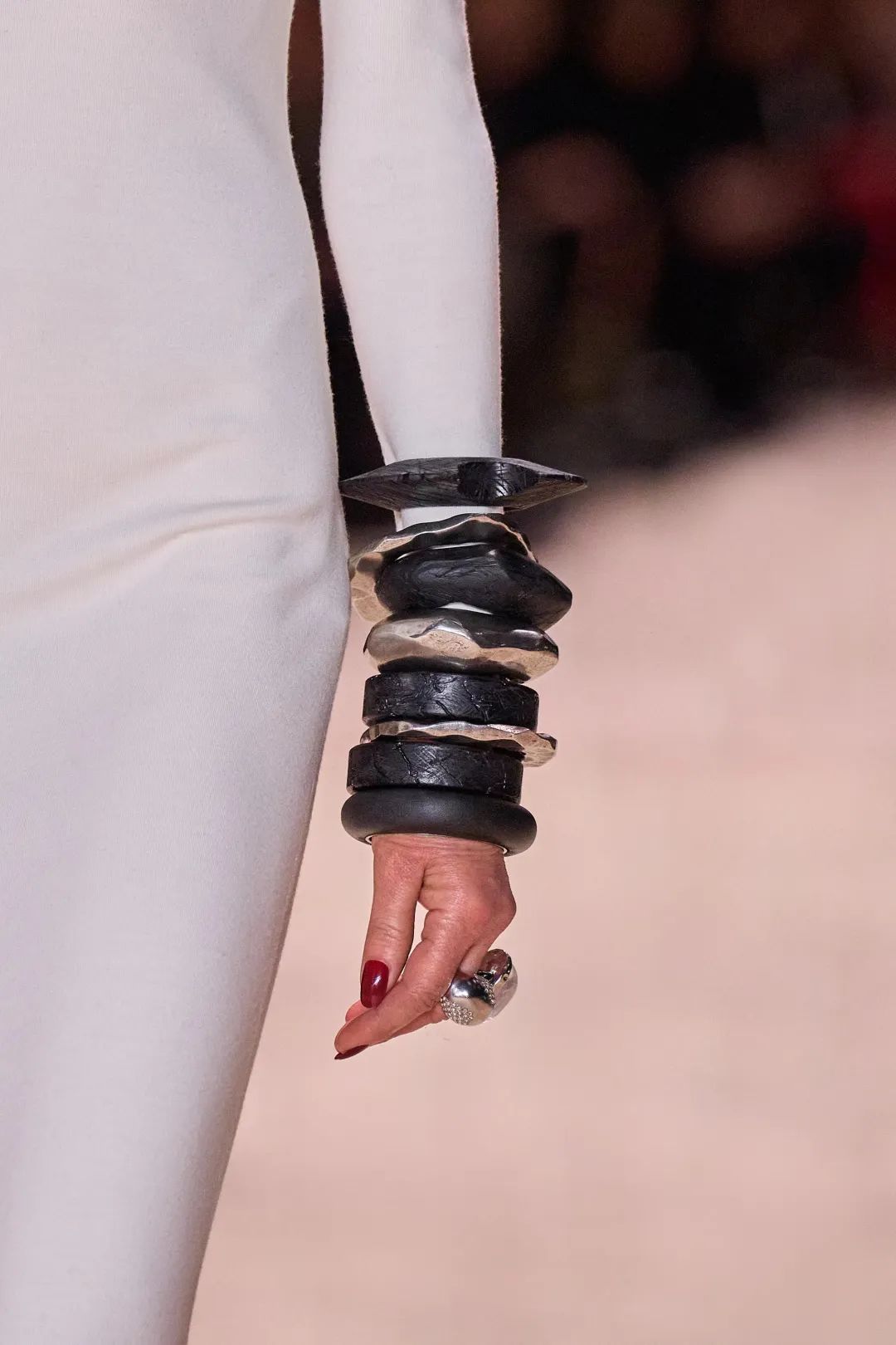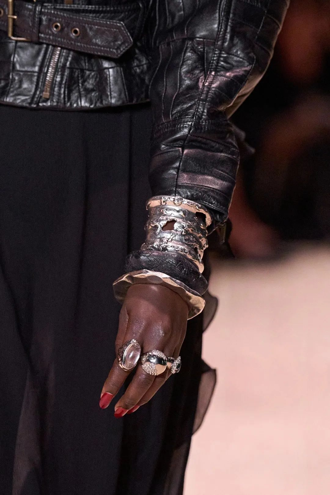 在本季四大时装周当中,也不乏大面积使用金属元素的品牌。Saint Laurent 2022秋冬系列在埃菲尔铁塔下上演,金属元素也成为了整场造型最大亮点之一,叠搭的金、银、铜手镯用多元的搭配方式,在腕间构造出丰富的层次感。