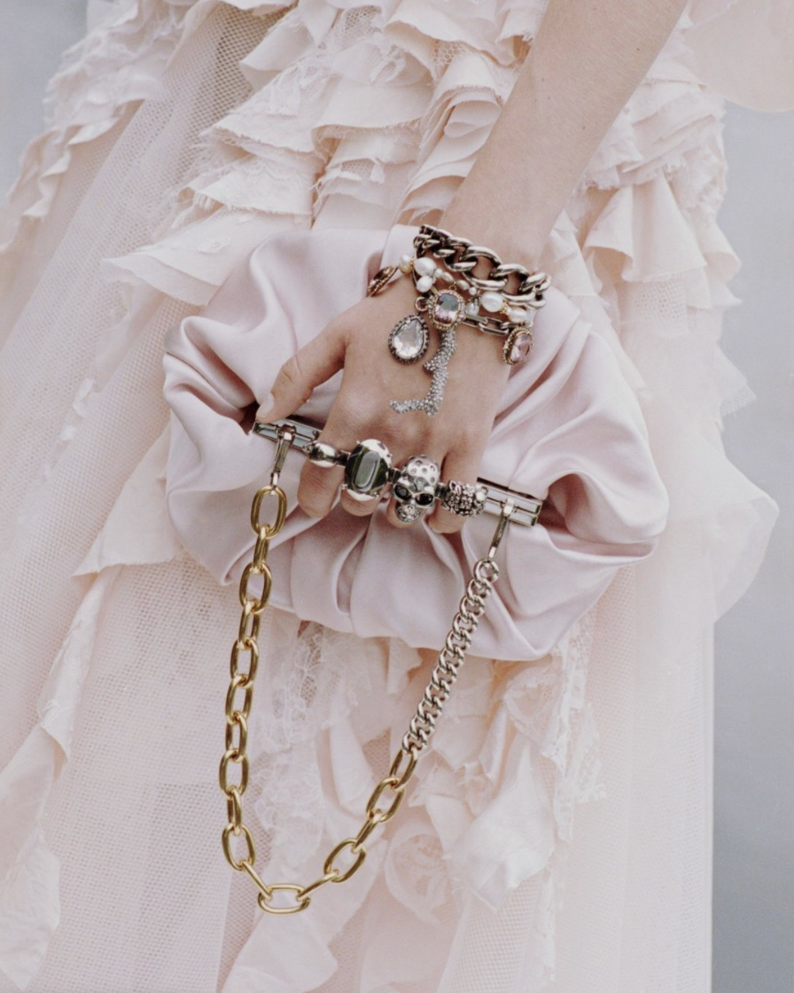 向来是暗黑风格代名词的Alexander McQueen,也非常喜欢运用大量的金属配饰,品牌最具识别度的无疑就是各种骷髅头金属装饰,尤其是可以当首饰来用的Four Ring系列包包也已成为标识性包款。