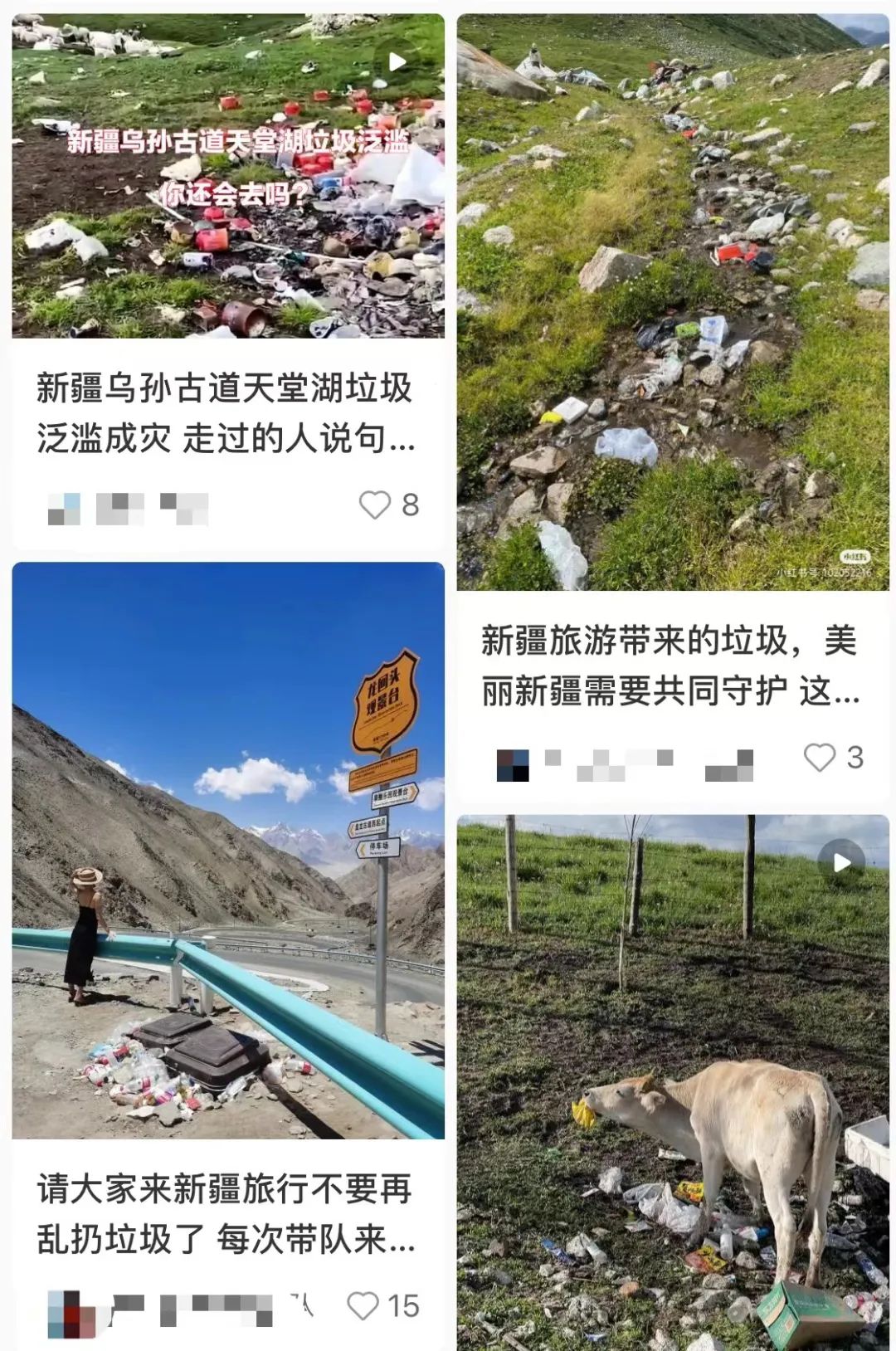 很多网友随之曝光,新疆何止独库公路,哈熊沟、乌孙古道等景区都垃圾成堆,,这些塑料垃圾在动物体内没法消化,此前就有动物因误食塑料袋而死亡。