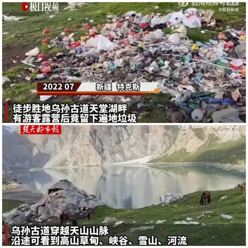 新疆的徒步胜地乌孙古道天堂湖畔就有游客露营后留下遍地垃圾,当地文旅局呼吁领队和驴友别乱扔垃圾,但依旧。
