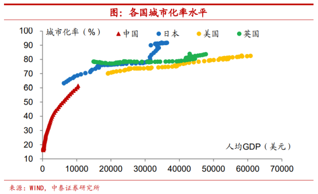 一个好消息是,我国的城市化水平还有一定向上腾挪的空间,目前的64%,跟其他发达国家相比,还有近十个点的增长空间。