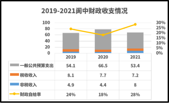 再以阆中市为例,2021年,这个城市一般公共预算收入才15.2亿元,但财政支出就高达53.4亿,是收入的三倍有余。