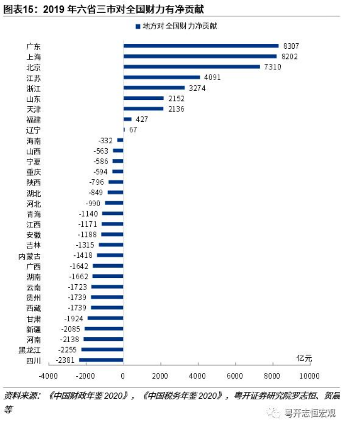 2019年,全国只有广东、上海、北京、江苏、浙江、山东等省市对国家财力有净贡献。