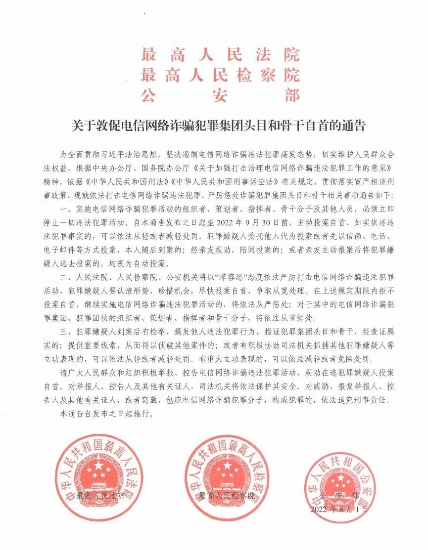 一、实施电信网络诈骗犯罪活动的组织者、策划者、指挥者、骨干分子及其他人员,必须立即停止一切违法犯罪活动。自本通告发布之日起至2022年9月30日前,主动投案自首、如实供述违法犯罪事实的,可以依法从轻或者减轻处罚。犯罪嫌疑人委托他人代为投案或者先以信函、电话、电子邮件等方式投案,本人随后到案的;经亲友规劝,陪同投案的;或者亲友主动报案后将犯罪嫌疑人送去投案的,均视为自动投案。