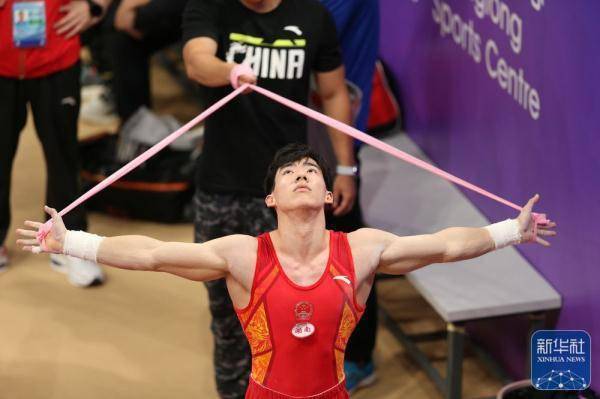 ↑张博恒在比赛间隙进行拉伸。新华社记者 许雅楠 摄