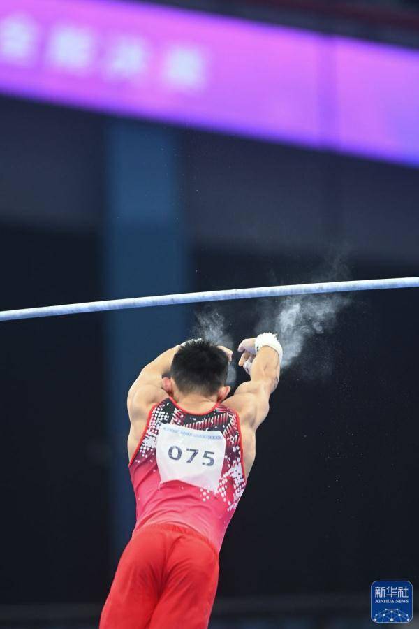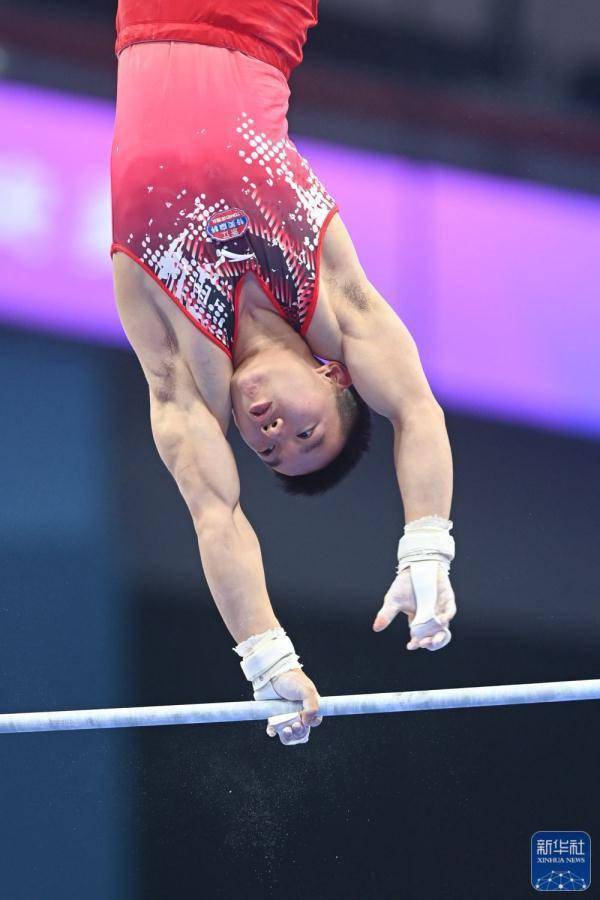 ↑杨皓楠在单杠比赛中。新华社记者 黄宗治 摄