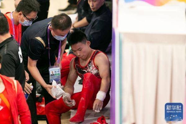 ↑杨皓楠(右一)在比赛中受伤后接受治疗。新华社记者 许雅楠 摄