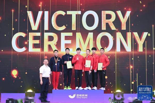 ↑冠军张博恒(右四)在颁奖仪式上。新华社记者 黄宗治 摄