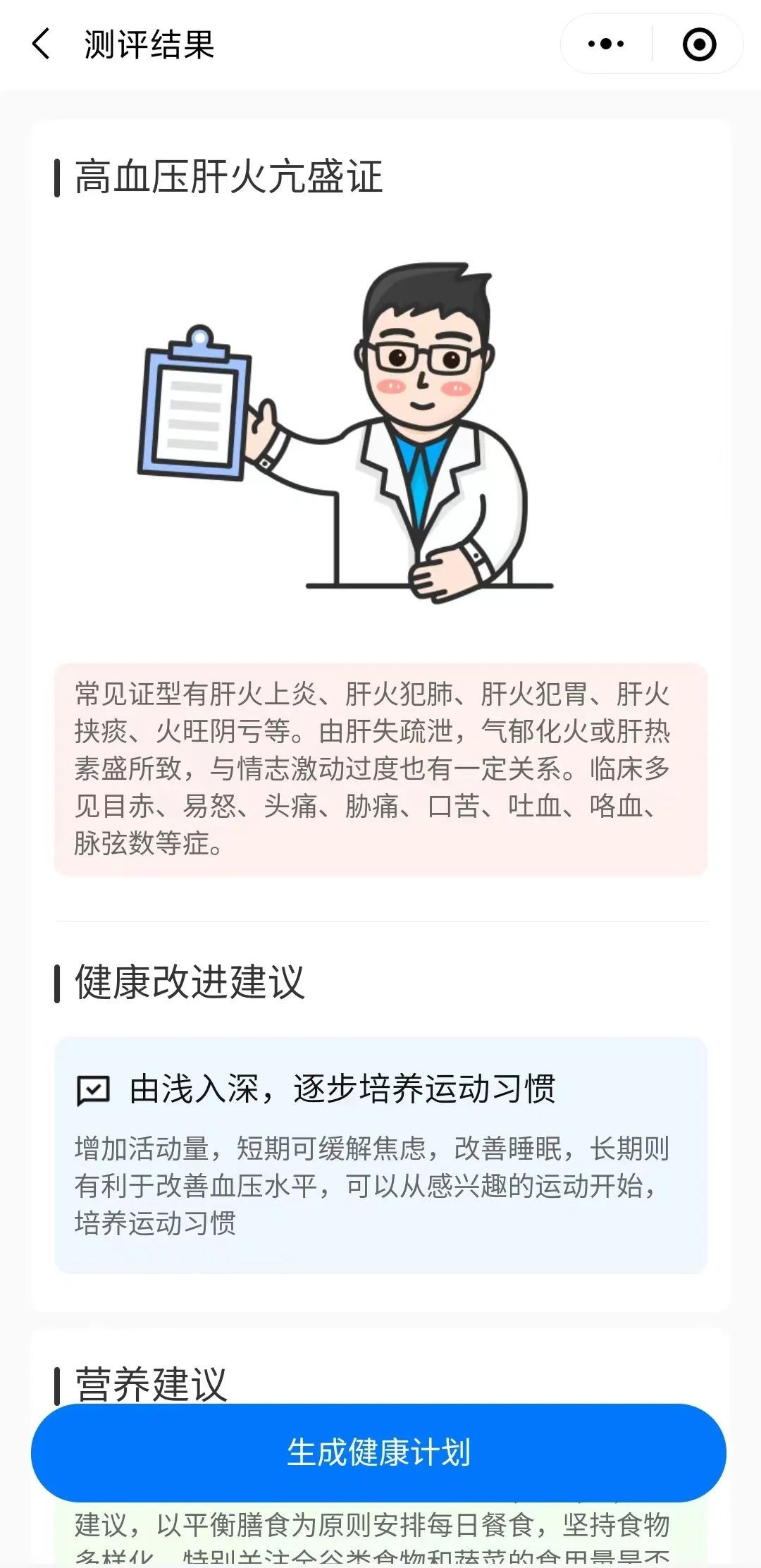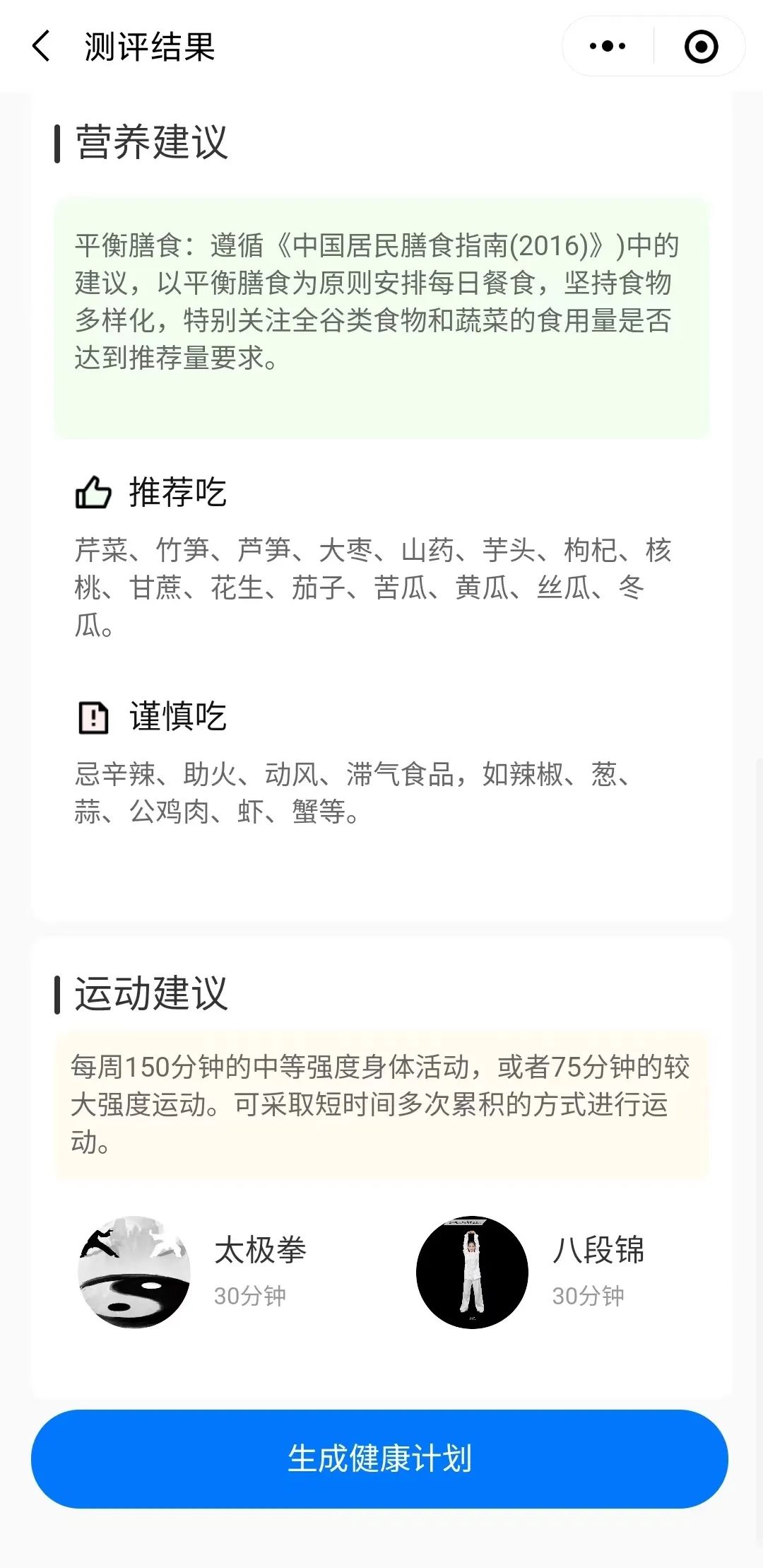 完成湖南中医药大学权威认证的健康测评后,生成测评结果,包含健康改进建议、营养建议、运动建议。