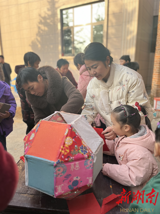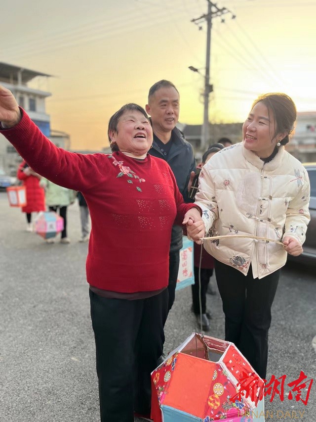 下午4点,娄底市文化旅游广电体育局党组书记、局长彭一伶来到了村里的老屋,和传承人一起为龙收尾,挂上龙须,寓意有头有尾。为秆龙披上红鳞、点睛点舌,预示着来年生龙活虎,日子越来越红火。之后,彭局长和村民边聊边糊灯笼,讲秆龙的传承,讲党的好政策下农村的幸福生活。一个小时后,锣鼓敲起来,鞭炮响起来,花灯点起来,彭局长把着新扎的秆龙带领大家从老屋出发,沿着传统的线路游灯、走家串户,拉开了癸卯年秆龙闹新春的序幕。