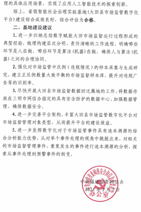 关于反馈大田县市场监管数字化中心省级智能社会治理实验综合基地中期评估意见及建议的函