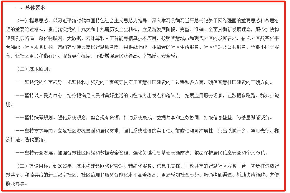 2022年5月,九部门印发《关于深入推进智慧社区建设的意见》的通知,《意见》提出,到2025年,基本构建起网格化管理、精细化服务、信息化支撑、开放共享的智慧社区服务平台,初步打造成智慧共享、和睦共治的新型数字社区,社区治理和服务智能化水平显著提高,更好感知社会态势、畅通沟通渠道、辅助决策施政、方便群众办事。
