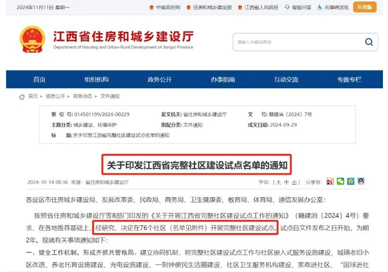 江西省住房和城乡建设厅发布《关于印发江西省完整社区建设试点名单的通知》决定在76个社区开展完成社区建设点。