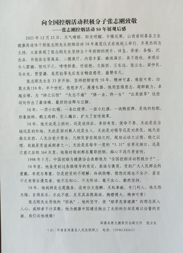 张志刚先生自 33 岁开始,坚持控烟宣传 50 年,精神可嘉、难能可贵、功