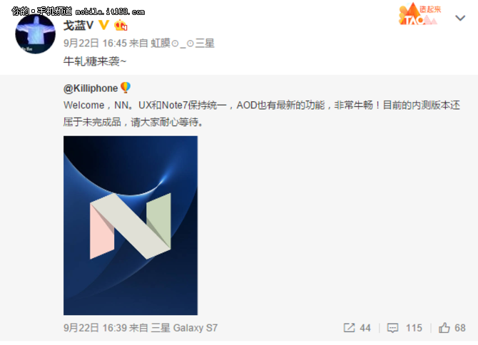 微博网友此前预告将自己的三星Galaxy S7刷成安卓7.0系统,并表示将放出一张截图,遗憾的是,从其后来放出的截图上,我们并不能看到新系统下的主屏界面,而这张截图有可能是查看安卓版本号后出现的界面。同时,从其爆料的文字来看,三星Galaxy S7/S7 edge将得到全新的Grace UX用户界面,这是目前三星Galaxy Note7独占的系统,拥有更好的性能和更佳的流畅度。同时,@Killiphone 表示AOD(熄屏显示)也会增加新的功能,值得期待。不过目前内测版尚未完成,需要耐心等待。