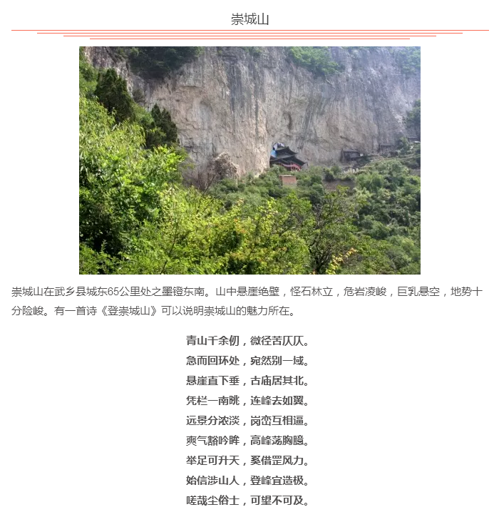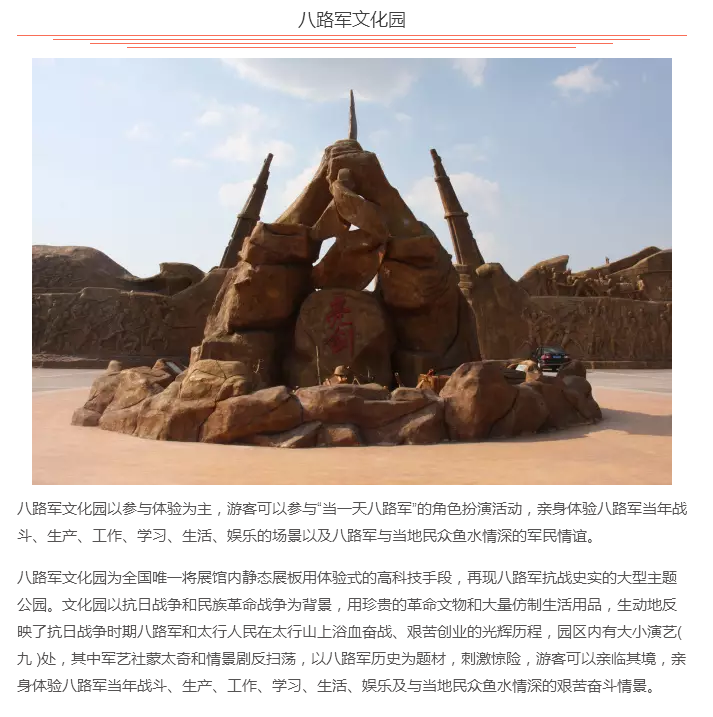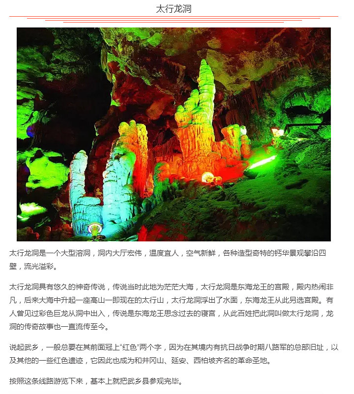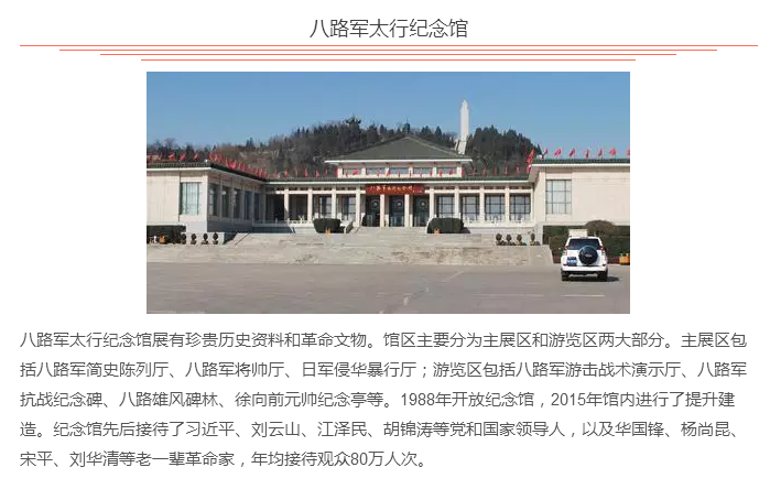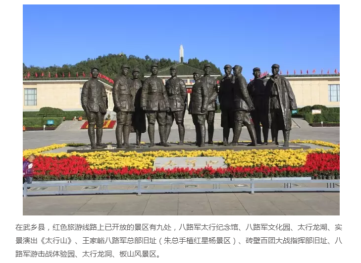 武乡县隶属于长治市管辖,因其境内有武山和乡水而得名。面积1610平方公里,人口24万。主要旅游资源都是围绕“红色旅游”开发,每年来旅游的游客除了个人游外,还会有一些机关事业单位和文教团体来学习革命精神,增强爱国主义情怀,激励其努力学习工作。