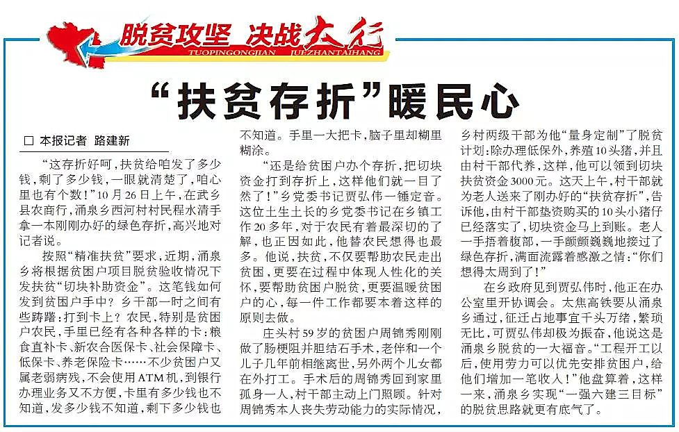 “ 这存折好呵,扶贫给咱发了多少钱,剩了多少钱,一眼就清楚了,咱心里也有个数!”10 月26 日上午,在武乡县农商行,涌泉乡西河村村民程水清手拿一本刚刚办好的绿色存折,高兴地对记者说。