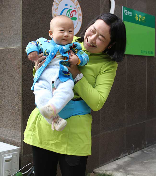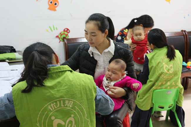 “优儿帮”在为社区小宝宝做身体健康检查,从旁指导宝宝在健康生活中快乐的成长