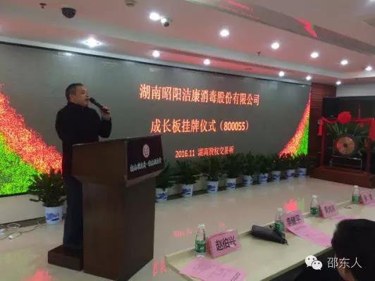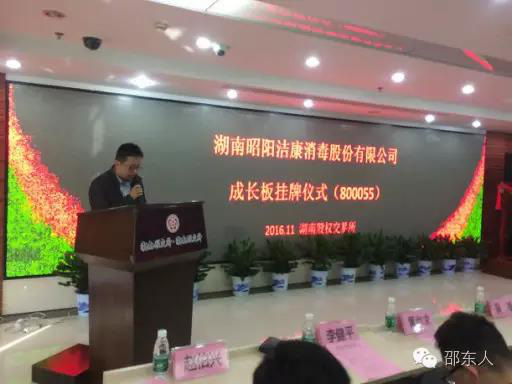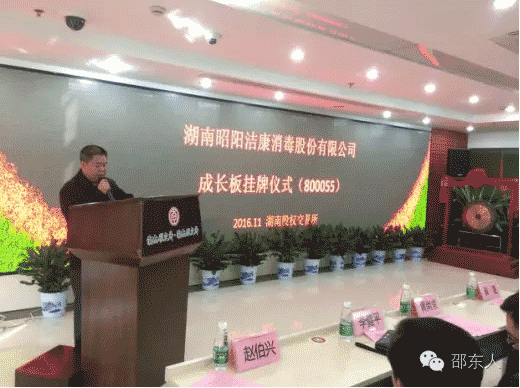 2016年11月2日下午,湖南昭阳洁康消毒服务股份有限公司(简称“洁康消毒”,股权代码:800055)在湖南股交所交易大厅举行了隆重的挂牌仪式,成为全省首家登陆湖南股交所股改板的餐具消毒企业。邵东县卫生监管部门、湖南股交所等相关部门领导出席了本次活动,各界新闻媒体以及担任此次挂牌服务的推荐商、会计师事务所和律师事务所等机构出席并见证了这一重要时刻。