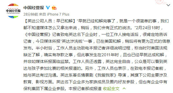中国经营报2月24日报道,“早就已经和解完事了,就是一个很简单的事,我们都不知道媒体怎么又拿出来说,稍后,我们会有正式的说法。”2月24日18时,《中国经营报》记者致电英达名下企业时,一位工作人接电话后,很肯定地告诉记者,今日媒体所报“英达涉洗钱”一事,已在美国和解,稍后将有更为正式的信息发布。