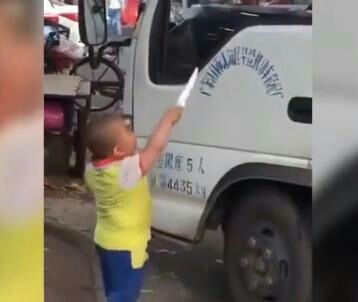 看司机不下车,就骂着拿起尖刀作势要刺轮胎,整个场面让人无语。这么小的孩子为什么就如此霸气如此匪气如此痞气呢?这真的是恶霸从小养成啊!