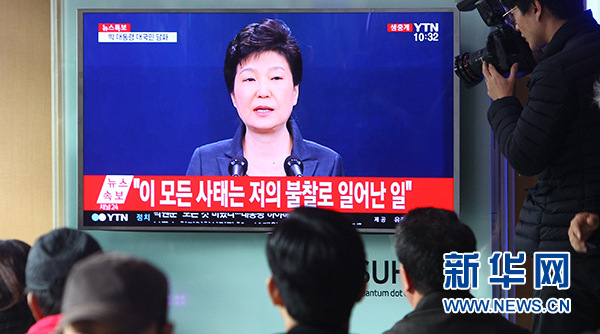 11月4日,在韩国首尔火车站,人们观看总统朴槿惠对国民讲话的电视直播。韩国总统朴槿惠4日发表对国民讲话时表示,如果国民要求的话,为查明真相,将诚实配合检方调查。