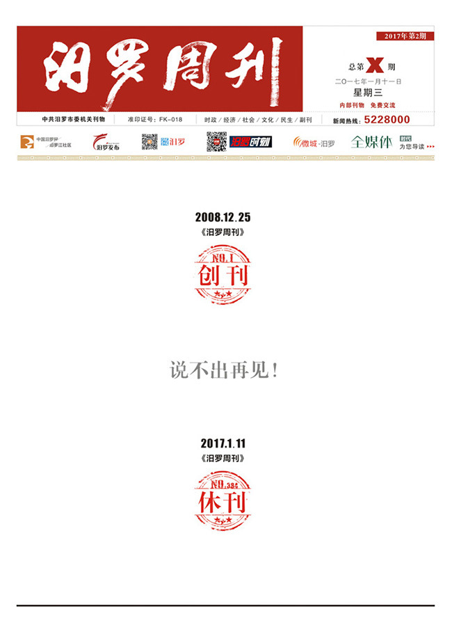 从2008年12月25日至2017年1月11日,8年16天,《汨罗周刊》光荣地完成了时代赋予她的责任与使命,自本周起,正式休刊。