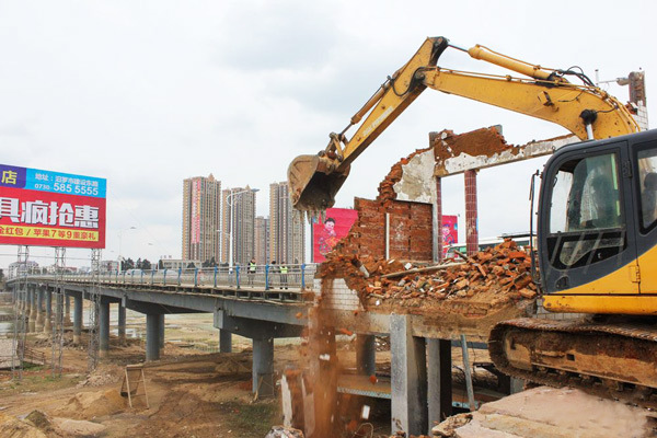 罗江镇政府在红花大桥拆除违章建筑