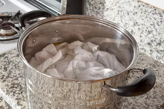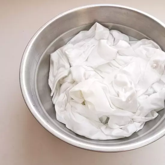 锅内加水,倒上小苏打和盐。水烧开,关火,将白色衣服浸入锅内。第二天清水洗净,跟盐一样白。