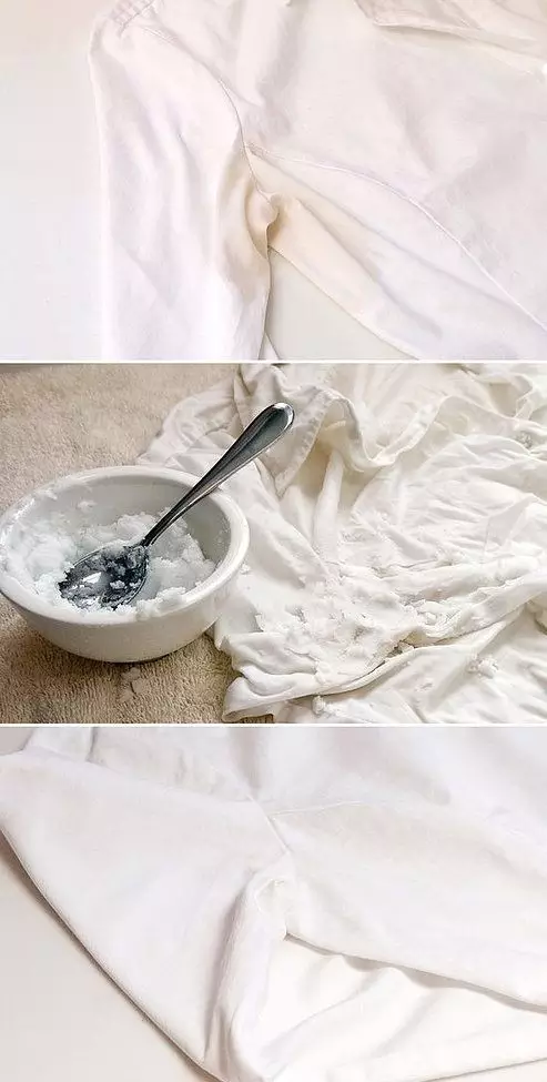 将过氧化氢、小苏打和水混合在碗里,涂在白衣服沾染污渍的地方,5-7分钟后刷去,冷水冲洗,衣服依然白白的。