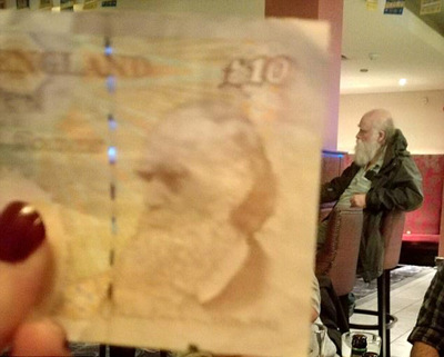 莱特拿出10英镑,将纸币上印着的达尔文肖像与那位绅士进行比对,他惊奇地发现,他们不仅是花白的大胡子像,连脸的朝向角度都异常相似。莱特笑称:“我只是跟朋友出来庆祝生日而已,没想到却有幸遇见了现实中的伟人!我想我应该请他一杯啤酒。”