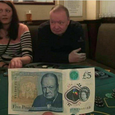 2017年1月,有网友在酒吧偶遇正在打扑克牌的著名政治家“丘吉尔”,高高的发际线、神似的五官,怎么看都跟5英镑纸币上的一模一样。照片上传网络后,立即收获了大片啧啧称奇声。