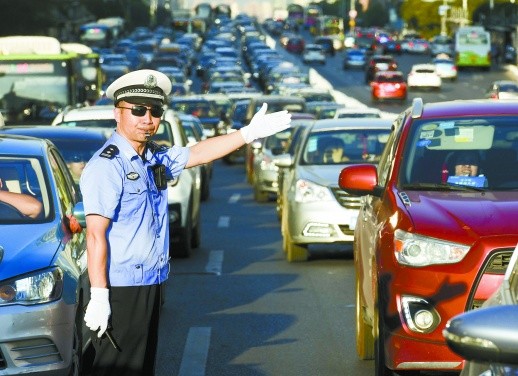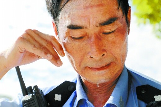 7月22日,常德市交警支队直属四大队民警曾祥富在指挥疏导交通的间隙,用手抹去脸上的汗水。他所执勤的路段,每天早、中、晚三个高峰时段,通过的总车流量接近2万台次。(图文/陈自德 文/湖南日报记者 马俊达)