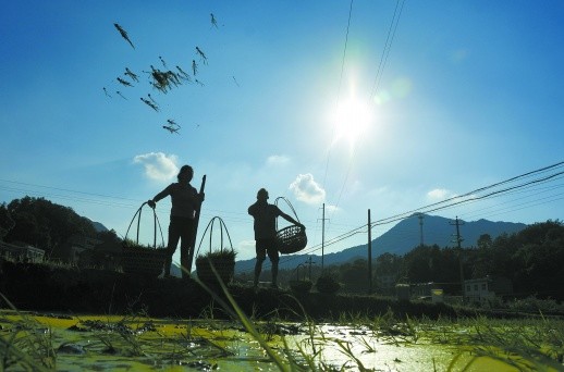 7月24日17时30分,双峰县井字镇黄巢村,村民在田间抛秧。为避开高温给晚稻秧苗带来的影响,当地群众选择在清晨和傍晚时分抛秧。(图/李建新 文/湖南日报记者 马俊达)