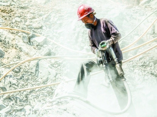 7月25日上午10时50分,湘西经开区双河文教卫新区PPP项目工地上,风炮工人在进行钻凿炮眼施工。天气炎热,该区结合实际,及时调整了各项目工地工人作息时间,确保施工安全。(图/刘振军 张术杰)